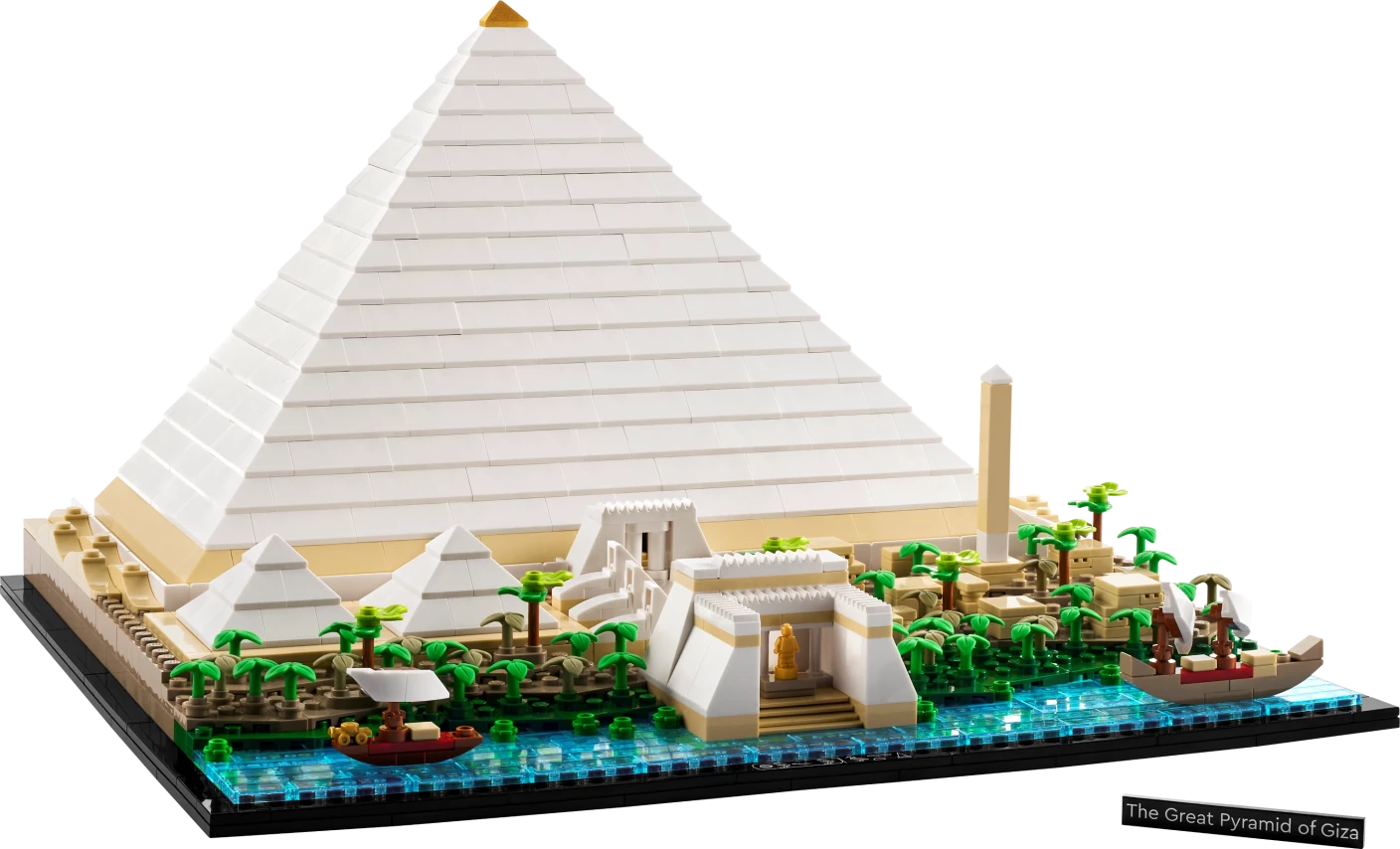 Een van de bijzonderheden is de manier waarop LEGO de omliggende omgeving heeft vormgegeven. Je ziet de rivier de Nijl met schepen die goederen en mensen vervoeren, kleine structuren die tempels of arbeidersdorpen voorstellen en zelfs een stukje woestijn. Deze sfeervolle details zorgen voor een levendige scène die de historische context benadrukt. Zo beleef je niet alleen de piramide zelf, maar ook de cultuur die eromheen bloeide.